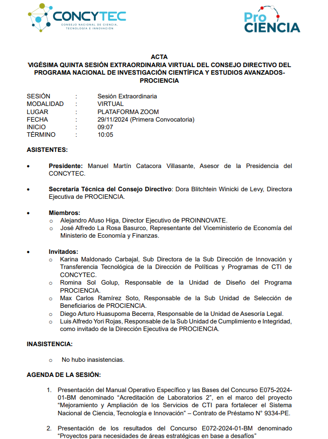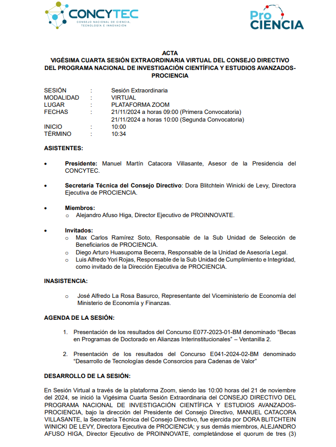 ACTA VIGÉSIMA CUARTA SESIÓN EXTRAORDINARIA VIRTUAL DEL CONSEJO DIRECTIVO DEL PROGRAMA NACIONAL DE INVESTIGACIÓN CIENTÍFICA Y ESTUDIOS AVANZADOS PROCIENCIA