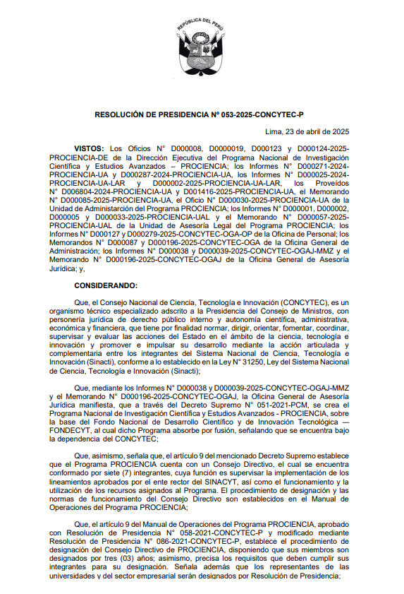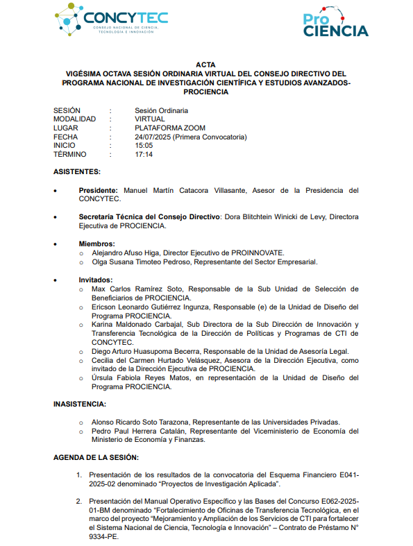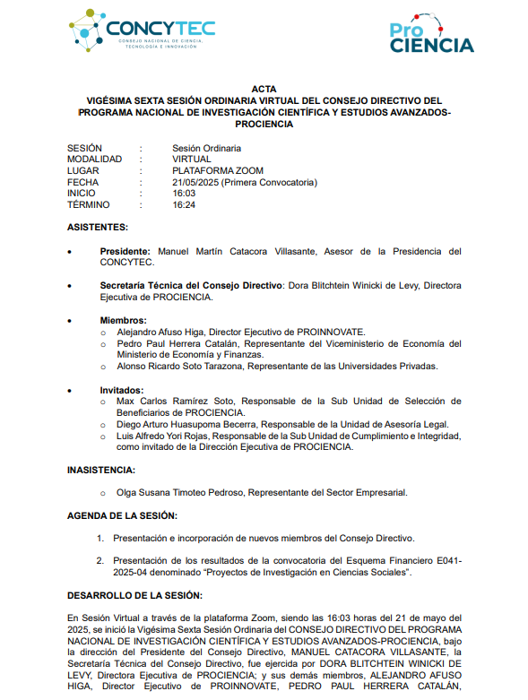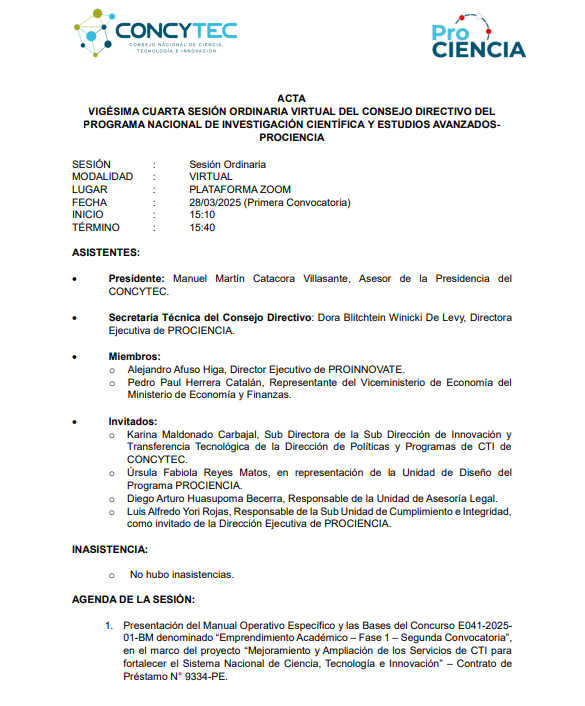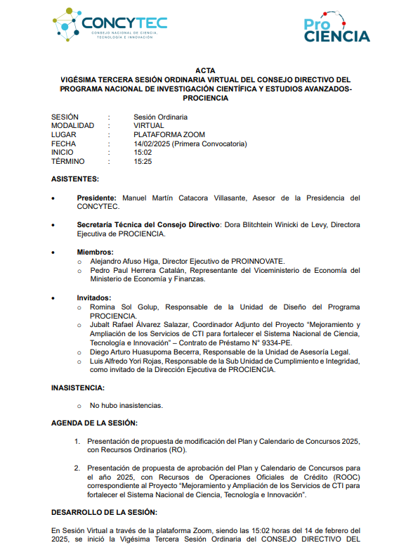 ACTA VIGÉSIMA QUINTA SESIÓN EXTRAORDINARIA VIRTUAL DEL CONSEJO DIRECTIVO DEL PROGRAMA NACIONAL DE INVESTIGACIÓN CIENTÍFICA Y ESTUDIOS AVANZADOS PROCIENCIA
