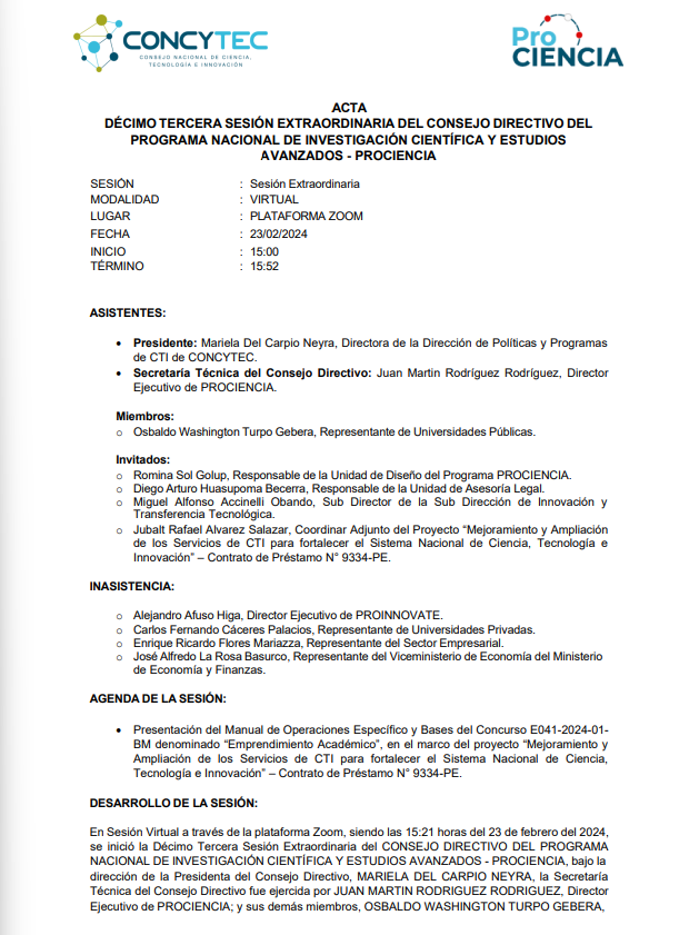ACTA DÉCIMO TERCERA SESIÓN EXTRAORDINARIA DEL CONSEJO DIRECTIVO DEL PROGRAMA NACIONAL DE INVESTIGACIÓN CIENTÍFICA Y ESTUDIOS AVANZADOS – PROCIENCIA